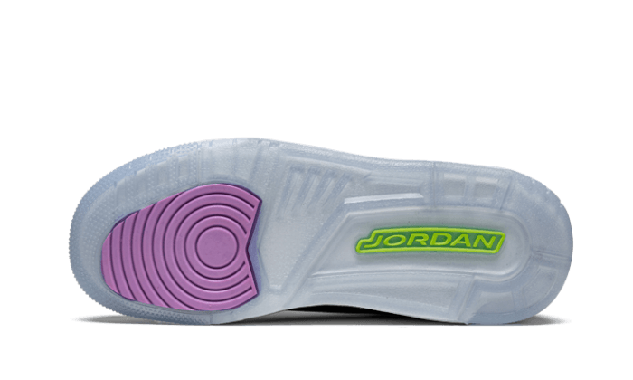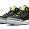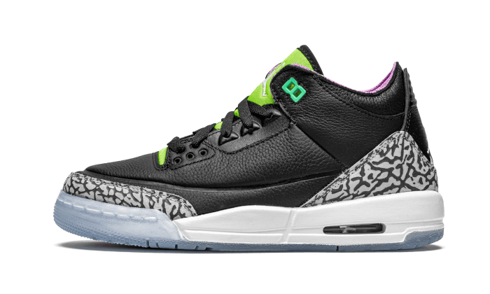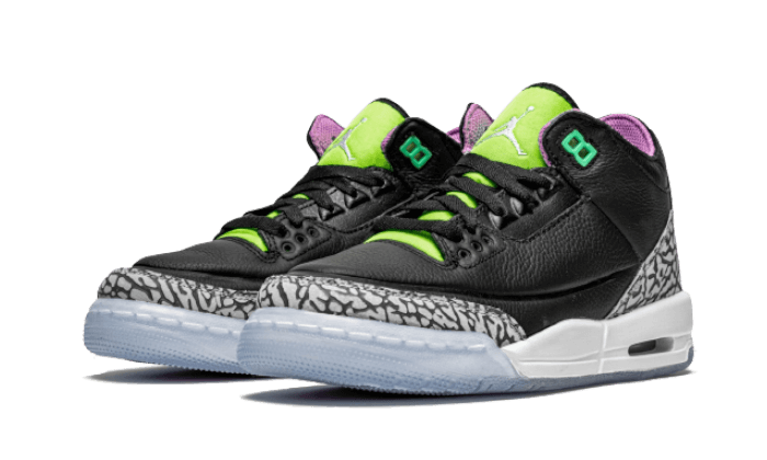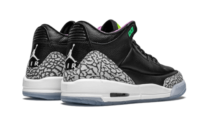 Il Air Jordan 3 Electric Green presenta una base in pelle nera, combinata con inserti grigi Elephant StampaLa scarpa presenta una base in pelle nera, combinata con inserti grigi che corrispondono allo stile della silhouette, così come una lingua verde elettrico e fluorescente. Altre finiture includono un logo biancoJordan logo sul tallone, una fodera viola e un’intersuola bianca abbinata a una suola ghiacciata.